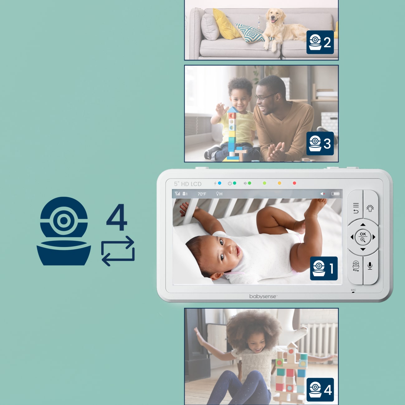 Multiple cameras, which are monitored through a single parent unit, allow you to watch two children or more without switching between screens or devices. Split-Screen functionality allows you to see both children at once, allowing you to be in 2 places at once! It eliminates the worry that the baby is not being seen while checking in on your toddler.